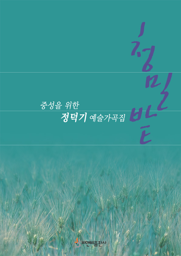 중성을 위한 가곡집 <청밀밭>은 가곡 애호가 분들이 쉽게 접할 수 있게끔 음역을 일반인들의 키에 맞춘 악보집입니다. 정덕기 교수는 대학시절부터 가곡에 관해 남다른 열정을 가져 주변 음악가들로부터 ‘한국의 슈베르트’, ‘가곡의 달인’으로 불리어졌습니다. 보통의 가곡들은 피아노가 노래하는 사람의 보조역할에서 벗어나지 못하는데, 정덕기 교수의 그것은 보컬과 대등한 위치에서 피아노도 가창자와 함께 노래하는 정통 예술가곡의 작품기법을 유지하고 있습니다. MBC 대학가곡제 수상곡인 타이틀곡 <청밀밭>을 포함해 총 44곡의 엄선된 작품들이 수록되어 있습니다.